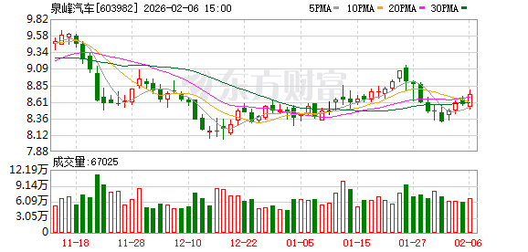 2月2日,泉峰汽车跌1.77%,成交额5940.46万元。两融数据显示,当日泉峰汽车获融资买入额388.98万 元,融资偿还402.75万元,融资净买入-13.77万元。截至2月2日,泉峰汽车融资融券余额合计1.07亿 元。 截至1月20日,泉峰汽车股东户数2.89万,较上期减少1.27%;人均流通股11752股,较上期增加1.29%。 2025年1月-9月,泉峰汽车实现营业收入19.30亿元,同比增长22.99%;归母净利润-2.30亿元,同比增长 39.46%。 分红方面,泉峰汽车A股上市后累计派现5999.66万元。近三年,累计派现0.00元。 声明:市场有风险,投资需谨慎。本文基于第三方数据库自动发布,不代表新浪财经观点,任何在本文 出现的信息均只作为参考,不构成个人投资建议。如有出入请以实际公告为准。如有疑问,请联系 biz@staff.sina.com.cn。 责任编辑:小浪快报 融资方面,泉峰汽车当日融资买入388.98万元。当前融资余额1.06亿元,占流通市值的3.77%,融资余 额低于近一年50%分位水平,处于较低位。 融券方面,泉峰汽车2月2日融券偿还1600.00股,融券卖出100.00 ...