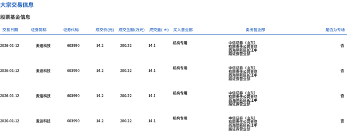 Group 1 - On January 12, 2026, Madi Technology executed a block trade of 2.1513 million shares, with a total transaction value of 30.5485 million yuan, accounting for 5.62% of the total trading volume for that day [1] - The transaction price was 14.2 yuan, representing an 11.53% discount compared to the market closing price of 16.05 yuan [1] - The block trade involved multiple institutional buyers, indicating strong interest from institutional investors [2][3] Group 2 - The trading data shows that the transaction price remained consistent at 14.2 yuan across various trades on the same day [2][3] - The total transaction amounts for different institutional buyers varied, with the highest being 873.3 thousand yuan [3] - The involvement of specialized institutional trading departments suggests a strategic approach to acquiring shares at a discounted price [2][3]