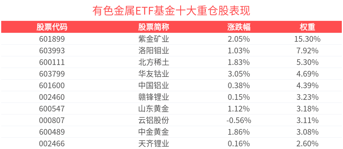 2月12日,三大指数盘中走强,有色金属板块相对强势,截至10:04,有色金属ETF基金(516650)上涨1.36%,其持仓股宝钛股份上涨5.97%,盛和资源上涨 5.87%,华友钴业、厦门钨业、腾远钴业等股涨幅居前,黄金ETF华夏(518850)跌0.1%,黄金股ETF(159562)涨0.43%。 统计显示,有色金属ETF基金(516650)近23个交易日内有15日资金净流入,合计"吸金"68.45亿元,杠杆资金持续布局中,有色金属ETF基金最新融资买入额 达1037.14万元,最新融资余额达8216.52万元。 广发期货分析指出,市场止跌回升后多头信心有所修复但当前宏观不确定性仍较多,一方面美股美债市场的流动性受到美国经济数据及政策预期影响,另一 方面央行及ETF的黄金投资需求回暖需时间验证。春节前后波动收窄关注20日均线的支撑,若出现利空消息价格不排除再度测试60日均线。在市场保持谨慎 并不断降低杠杆水平情况下,若持仓过节需控制仓位并适时对冲下跌风险,关注金银比回升。 | 股票代码 | 股票简称 | 涨跌幅 | 权重 | | --- | --- | --- | --- | | 601899 | 紫金矿 ...