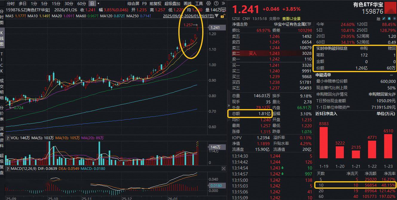洛阳钼业完成巴西金矿收购!有色ETF华宝(159876)猛拉5%,量价齐创历史新高!获资金净申购超1.2亿份!
