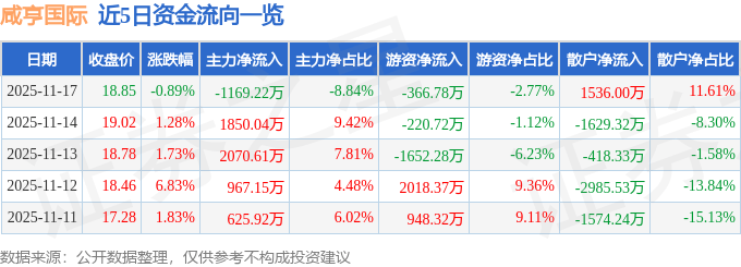 股票行情快报:咸亨国际(605056)11月17日主力资金净卖出1169.22万元