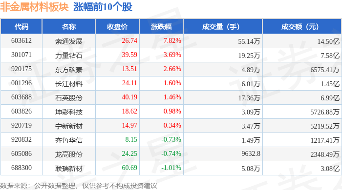 Core Viewpoint - The non-metal materials sector experienced a rise of 2.05% on November 7, with Suotong Development leading the gains, while the Shanghai Composite Index fell by 0.25% and the Shenzhen Component Index decreased by 0.36% [1] Sector Performance - The non-metal materials sector saw a net inflow of 218 million yuan from institutional investors, while retail investors experienced a net outflow of 182 million yuan [1] - The following companies showed significant price movements: - Suotong Development (603612) closed at 26.74, up 7.82% with a trading volume of 551,400 shares and a transaction value of 1.45 billion yuan - Power Diamond (301071) closed at 65.66, up 3.69% with a trading volume of 192,500 shares and a transaction value of 758 million yuan - Other notable companies include: - Dongfang Shuosu (920175) up 2.66% - Changjiang Materials (001296) up 1.60% - Quartz Shares (603688) up 1.46% [1] Individual Stock Analysis - The following companies experienced declines: - Qilu Huaxin (920832) down 0.73% - Longgao Shares (605086) down 0.74% - Lianrui New Materials (688300) down 1.01% [1]