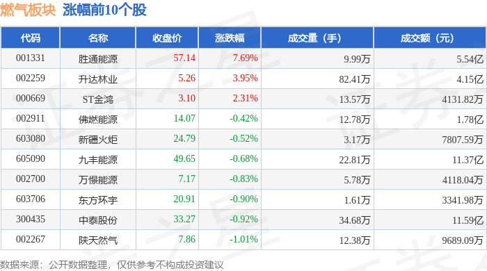 | 代码 | 名称 | 收盘价 | 涨跌幅 | 成交量(手) | 成交额(元) | | --- | --- | --- | --- | --- | --- | | 001331 | 胜通能源 | 57.14 | 7.69% | 9.99万 | 5.54亿 | | 002259 | 升达林业 | 5.26 | 3.95% | 82.41万 | 4.15亿 | | 000669 | ST金鸡 | 3.10 | 2.31% | 13.57万 | 4131.82万 | | 002911 | 佛燃能源 | 14.07 | -0.42% | 12.78万 | 1.78亿 | | 603080 | 新疆火炬 | 24.79 | -0.52% | 3.17万 | 7807.59万 | | 605090 | 九丰能源 | 49.65 | -0.68% | 22.81万 | 11.37亿 | | 002700 | 万憬能源 | 7.17 | -0.83% | 5.78万 | 4118.04万 | | 603706 | 东方环宇 | 20.91 | -0.90% | 1.61万 | 3341.98万 | | 300435 | 中泰 ...