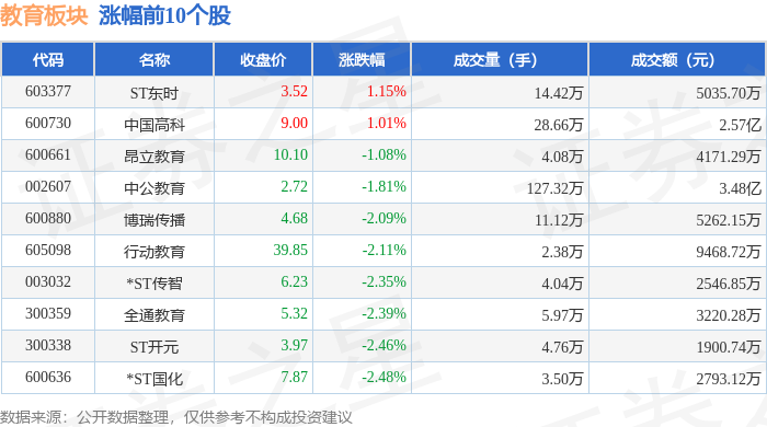 证券之星消息,10月17日教育板块较上一交易日下跌2.68%,创业黑马领跌。当日上证指数报收于 3839.76,下跌1.95%。深证成指报收于12688.94,下跌3.04%。教育板块个股涨跌见下表: | 代码 | 名称 | 收盘价 | 涨跌幅 | 成交量(手) | 成交额(元) | | --- | --- | --- | --- | --- | --- | | 603377 | ST东时 | 3.52 | 1.15% | 14.42万 | 5035.70万 | | 600730 | 中国高科 | 9.00 | 1.01% | 28.66万 | 2.57亿 | | 600661 | 昂立教育 | 10.10 | -1.08% | 4.08万 | 4171.29万 | | 002607 | 中公教育 | 2.72 | -1.81% | 127.32万 | 3.48亿 | | 600880 | 博瑞传播 | 4.68 | -2.09% | 11.12万 | 5262.15万 | | 605098 | 行动教育 | 39.85 | -2.11% | 2.38万 | 9468.72万 | | 003032 | *ST ...