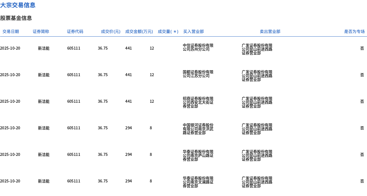 | 交易日期 | 证券简称 | 证券代码 | | | 成交价(元) 成交金额(万元) 成交量(*) 买入营业部 | | 卖出营业部 | | --- | --- | --- | --- | --- | --- | --- | --- | | 2025-10-20 | 新洁能 | 605111 | 36.75 | 441 | 12 | 中信证券股份有限 公司苏州分公司 | 公司局 | | 2025-10-20 | 新洁能 | 605111 | 36.75 | 441 | 12 | 因都证索埃公有限 | 公司昆山部分离路 | | 2025-10-20 | 新洁能 | 605111 | 36.75 | 441 | 12 | 招商正秦报公寓限 公司英家北关键证 美国计制 | 公含量出品,并且 | | 2025-10-20 | 新洁能 | 605 II I | 36.75 | 294 | 8 | 有限公司南京关贸 | 公昌能交换年度 | | 2025-10-20 | 新洁能 | 605111 | 36.75 | 294 | 8 | 装量正装股份有限 | 公司昆山高进西路 | | 2025-10-20 | 新洁能 | 60 ...