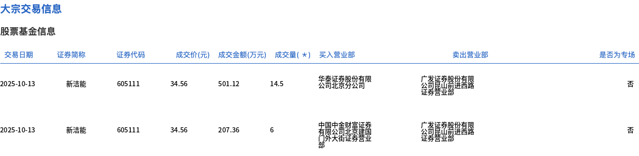 10月13日,新洁能大宗交易成交20.5万股,成交额708.48万元,占当日总成交额的0.42%,成交价34.56元,较市场收盘价37.99元折价9.03%。 | 交易日期 | 证券简称 | 证券代码 | 成交价(元) | 成交金额(万元) | 成交量(*) 买入营业部 | | | 卖出营业部 | | --- | --- | --- | --- | --- | --- | --- | --- | --- | | 2025-10-13 | 新洁能 | 605111 | 34.56 | 501.12 | 14.5 | 华泰证券股公有限 公司北京分公司 | 公司所 让去宣传 | | | 2025-10-13 | 新洁能 | 605111 | 34.56 | 207.36 6 | | 甲國中華 | 公司昆山市 | | ...