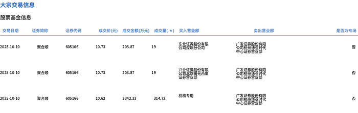 | 交易日期 | 证券简称 | 证券代码 | | | 成交价(元) 成交金额(万元) 成交量(*) 买入营业部 | | 类出营业部 | 是否为专场 | | | --- | --- | --- | --- | --- | --- | --- | --- | --- | --- | | 2025-10-10 | 聚合顺 | 605166 | 10.73 | 203.87 | 19 | 态部是我男公有限 | 公司 - 1998 | | Ka | | 2025-10-10 | 聚合顺 | 605166 | 10.73 | 203.87 | 19 | 실험 유명차물률 | 公司 2017年 | | KI | | 2025-10-10 | 聚合顺 | 605166 | 10.62 | 3342.33 | 314.72 | 机构专用 | 公營區品會登園製 | | KO | 10月10日,聚合顺大宗交易成交352.72万股,成交额3750.07万元,占当日总成交额的30.41%,成交均 价10.63元,较市场收盘价11.62元折价8.5%,其中最高成交价10.73元,最低成交价10.62元。 ...