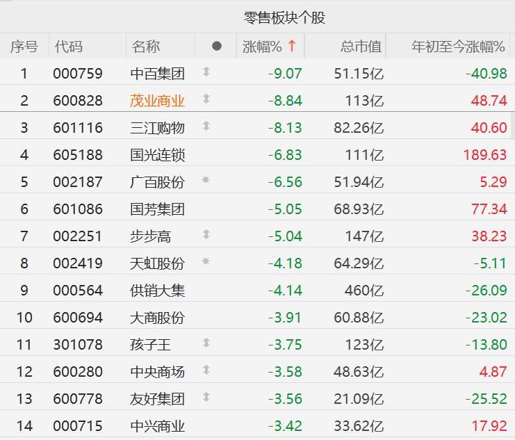 | | | | | 零售板块个股 | | | | --- | --- | --- | --- | --- | --- | --- | | 序号 | 代码 | 名称 | 0 | 涨幅%↑ | 总市值 | 年初至今涨幅%。 | | 1 | 000759 | 中百集团 | 1 | -9.07 | 51.15亿 | -40.98 | | 2 | 600828 | 戊山商业 | 1 | -8.84 | 113亿 | 48.74 | | 3 | 601116 | 三江购物 | 1 | -8.13 | 82.26 Z | 40.60 | | 4 | 605188 | 国光连锁 | | -6.83 | 111亿 | 189.63 | | 5 | 002187 | 广百股份 | 委 | -6.56 | 51.94亿 | 5.29 | | 6 | 601086 | 国芳集团 | | -5.05 | 68.93亿 | 77.34 | | 7 | 002251 | 步步高 | ﺑﻬ | -5.04 | 147亿 | 38.23 | | 8 | 002419 | 天虹股份 | નીદ | -4.18 | 64.29亿 | -5.11 ...