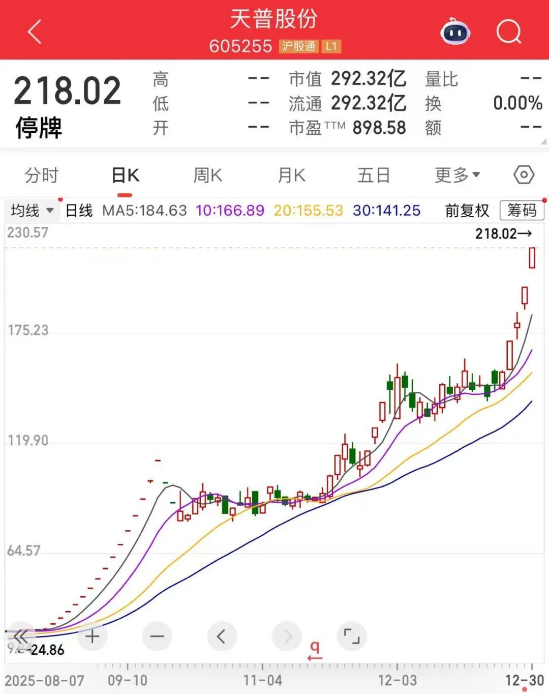 01-11 15:56:18 沪 天普股份、国晟科技、嘉美包装三大牛股相继发布公告,股票将于明日复牌。 天普股份(605255) 01-11 15:55:37 沪 | | | 218.02 所属行业: 交运设备 +0.74% > | | | | 查看所属板块 > | | --- | --- | --- | --- | --- | --- | --- | | 停牌 | | | 算力芯片 +1.88% 最相关 | | 新能源汽车 +1.14% | | | 4 开 | | 反 | 昌 | | 成交量 | | | BE ારિ | 218.02 | 最 | (म्स्ट | | 成交额 | | | 了有客动 | 1228.19 | 换手率 | | | 总市值 | 292亿 | | 分时 | 五日 | 日K | 围K | 月K | 分钟▼ | 0 | | 218.02 | MA5:184.632 MA10:166.891 MA20:155.529 | | | | | 前复权 | | 18.79 | 2025-08-01 | | 2025-10-16 | | 2025-11-20 | | | �������������� ...
