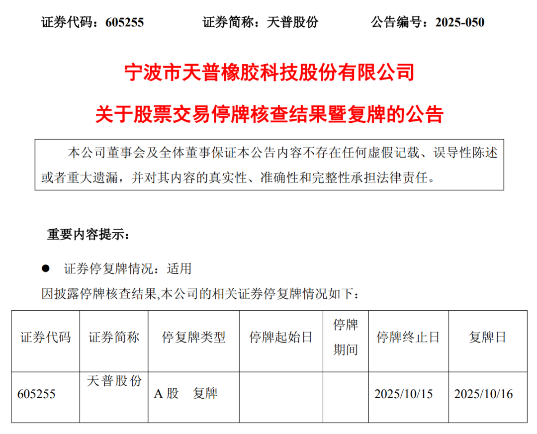 Group 1 - The core point of the news is that Tianpu Co., Ltd. (605255) has completed its investigation into abnormal stock trading fluctuations and will resume trading on October 16, 2025, after a significant price increase of 317.72% over 15 trading days, which deviated sharply from the Shanghai Composite Index and the automotive parts industry index [1] - The company has identified four insiders who engaged in stock trading from February 14 to August 14, 2025, and they have returned their profits to the company [1] - Tianpu Co., Ltd. emphasizes that its stock price has significantly deviated from the company's fundamentals, posing a risk of a sharp decline at any time [1] Group 2 - Regarding market rumors about acquisition matters, Tianpu Co., Ltd. confirmed that the acquiring party, Zhonghao Xinying (Hangzhou) Technology Co., Ltd., has initiated its independent IPO process and is currently in the shareholding reform stage [2] - The company clarified that there are no plans for asset injection from Zhonghao Xinying and that there are no significant changes or major adjustments planned for the company's main business in the next 12 months [2] - Following the signed equity transfer agreements, Zhonghao Xinying intends to acquire control of Tianpu Co., Ltd., with Yang Gongyifan becoming the actual controller after the transaction is completed [2] Group 3 - In the first half of 2025, Tianpu Co., Ltd. reported revenue of 151 million yuan, a year-on-year decrease of 3.44%, and a net profit of 11.298 million yuan, down 16.08% year-on-year [3] - The company stated that its production and operational activities are normal, with no significant changes in the internal and external operating environment [3]