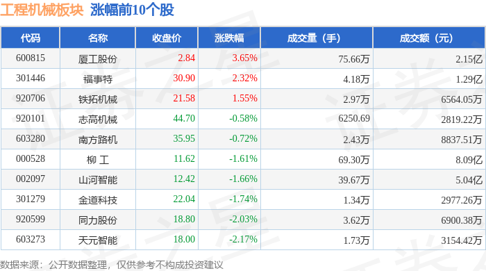 从资金流向上来看,当日工程机械板块主力资金净流出2.48亿元,游资资金净流入3.08亿元,散户资金 净流出6000.9万元。工程机械板块个股资金流向见下表: 以上内容为证券之星据公开信息整理,由AI算法生成(网信算备310104345710301240019号),不构成投资建议。 | 代码 | 名称 | 收盘价 | 涨跌幅 | 成交量(手) | 成交额(元) | | | --- | --- | --- | --- | --- | --- | --- | | 920706 | 铁拓机械 | 28.59 | 14.50% | 19.02万 | | 5.79亿 | | 301446 | 福事特 | 35.62 | 12.05% | 9.32万 | | 3.25 Z | | 600984 | 建设机械 | 4.60 | 10.05% | 125.90万 | | 5.74亿 | | 603280 | 南方路机 | 41.47 | 10.00% | 8.47万 | | 3.42 Z | | 301161 | 唯万密封 | 37.90 | 8.22% | 13.40万 | | 4.98亿 | | 920174 | 五新隧装 ...