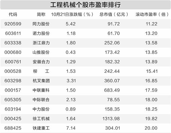 | | | 工程机械个股市盈率排行 | | | | --- | --- | --- | --- | --- | | 代码 | 简称 | 10月21日涨跌幅(%) 总市值(亿元) | | 滚动市盈率(倍) | | 665GOZG | 同力股份 | 5.42 | 91.72 | 11.22 | | 603611 | 诺力股份 | 1.18 | 61.70 | 13.20 | | 603338 | 浙江鼎力 | 1.80 | 252.06 | 13.58 | | 000680 | 山推股份 | 0.43 | 173.42 | 13.85 | | 600761 | 安徽合力 | 1.29 | 182.32 | 13.89 | | 000528 | 柳 工 | 1.53 | 242.44 | 15.41 | | 603298 | 杭叉集团 | 3.31 | 360.07 | 16.85 | | 000157 | 中联重科 | 1.50 | 683.49 | 17.59 | | 605305 | 中际联合 | 2.13 | 78.55 | 18.00 | | 603194 | 中力股份 | 0.89 | 158.35 | ...