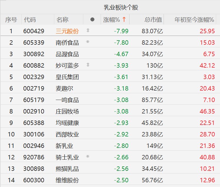 A股乳业股集体下跌,三元股份跌超7%,妙可蓝多跌超3%