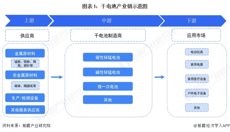 转自:前瞻产业研究院 以下数据及分析来自于前瞻产业研究院干电池研究小组发布的《2025-2030年中国干电池制造行业产销需 求与投资预测分析报告》 行业主要上市公司:安孚科技(603031)、野马电池(605378)、浙江恒威(301222)、长虹能源(920239)等 本文核心数据:产业链结构;企业区域分布 干电池产业链全景梳理:上游原材料简单,下游应用广泛 从干电池制造上游行业来看,干电池行业的上游供应商主要为电解二氧化锰粉、锌粉、隔离纸、钢壳、 碳棒、锌筒和铜针等生产制造企业。 从干电池制造下游应用市场来看,锌锰电池属于标准化产品,电池的尺寸、形状、性能规格等均具有国 际通用标准。由于制造工艺成熟、价格便宜、安全可靠、使用方便、放电和储存时间较长等优点,锌锰 电池目前已经成为了消费者日常生活中不可或缺的电子易耗品,主要应用场景包括电动玩具、家用电 器、家用医疗设备以及户外电子设备等产品。 从产业链具体涉及的企业来看,上游锰粉生产企业主要包括湘潭电化、汇元锰业、桂柳化工等,锌材厂 商主要包括宏达股份、驰宏锌锗、罗平锌电、西部矿业、中色股份等,而电池隔膜纸则包括上海恩捷、 星源材质、中材科技、中兴新材、河北 ...