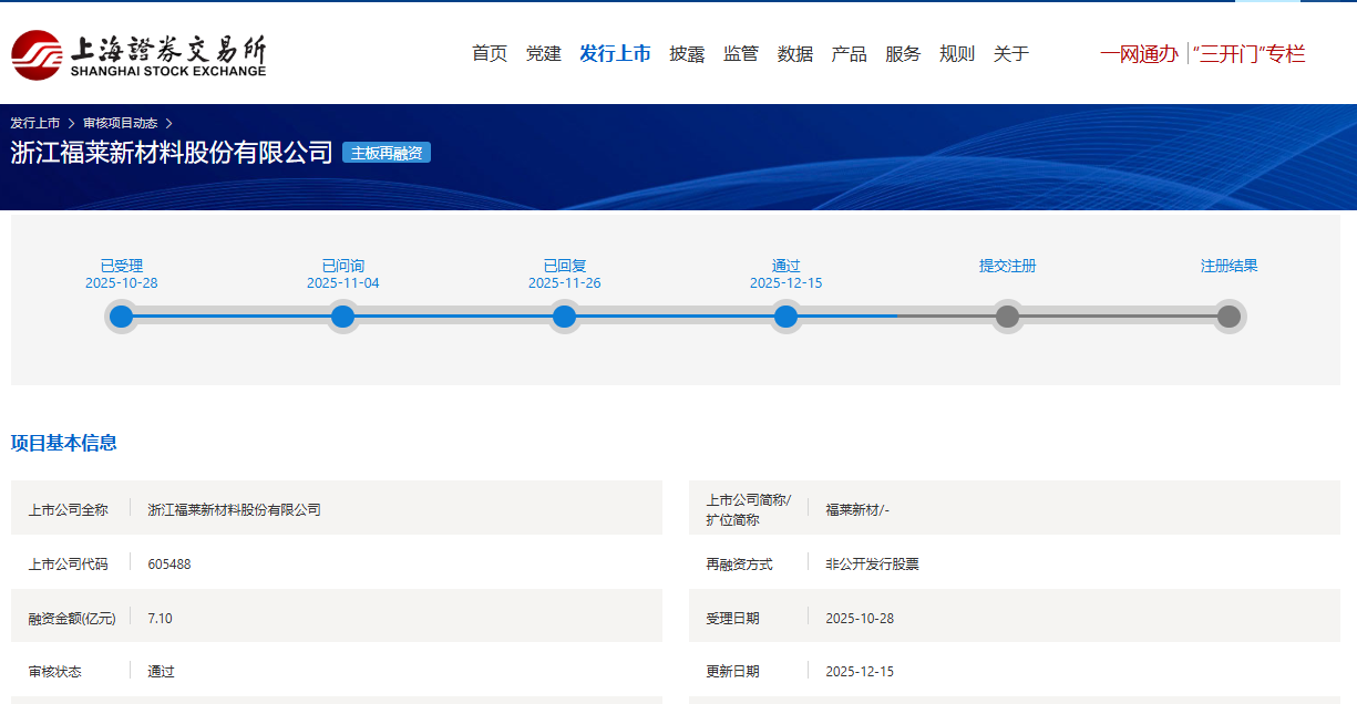 福莱新材向特定对象发行A股股票申请获上交所审核通过