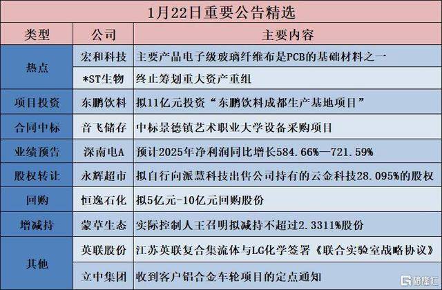 | | | 1月22日重要公告精选 | | --- | --- | --- | | 类型 | 公司 | 主要内容 | | 热点 | 宏和科技 | 主要产品电子级玻璃纤维布是PCB的基础材料之一 | | | *ST生物 | 终止筹划重大资产重组 | | 项目投资 | 东鹏饮料 | 拟11亿元投资"东鹏饮料成都生产基地项目" | | 合同中标 | 音飞储存 | 中标景德镇艺术职业大学设备采购项目 | | 业绩预告 | 深南电A | 预计2025年净利润同比增长584.66%-721.59% | | 股权转让 | 水辉超市 | 拟自行向派慧科技出售公司持有的云金科技28.095%的股权 | | 回购 | 恒逸石化 | 拟5亿元-10亿元回购股份 | | 增减持 | 蒙草生态 | 实际控制人王召明拟减持不超过2.3311%股份 | | 其他 | 英联股份 | 江苏英联复合集流体与LG化学签署《联合实验室战略协议》 | | | 立中集团 | 收到客户铝合金车轮项目的定点通知 烏勝隆版 | 华康洁净(301235.SZ):预中标5488万元项目 青山纸业(600103.SH):关联方中标公司污水处理提标改造项目设计采购施 ...