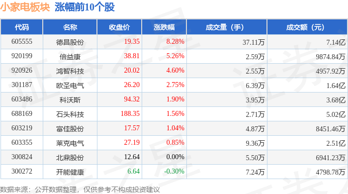 证券之星消息,10月29日小家电板块较上一交易日上涨0.76%,德昌股份领涨。当日上证指数报收于 4016.33,上涨0.7%。深证成指报收于13691.38,上涨1.95%。小家电板块个股涨跌见下表: | 代码 | 名称 | 收盘价 | 涨跌幅 | 成交量(手) | | 成交额(元) | | --- | --- | --- | --- | --- | --- | --- | | 605555 | 德昌股份 | 19.35 | 8.28% | | 37.11万 | 7.14亿 | | 6610Z6 | 倍益康 | 38.81 | 5.26% | | 2.59万 | 9874.84万 | | 920926 | 鸿智科技 | 20.02 | 4.60% | | 2.55万 | 4957.92万 | | 301187 | 欧圣电气 | 26.20 | 2.75% | 6 | 6.39万 | 1.64亿 | | 603486 | 科沃斯 | 94.32 | 1.90% | | 3.95万 | 3.68亿 | | 688169 | 石头科技 | 188.35 | 1.56% | | 2.71万 | 5.02亿 | | ...