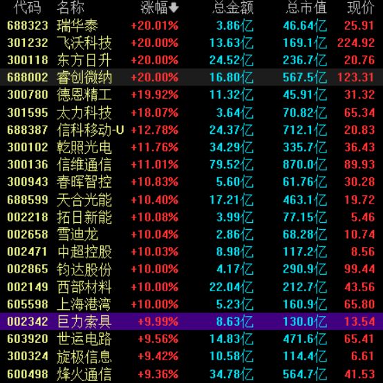 | 代码 | 名称 | | 涨幅% ↓ | 总市值 | 年初至今涨幅% | | --- | --- | --- | --- | --- | --- | | 300780 | 德恩精工 | 1 | 18.01 | 45.17亿 | 59.75 | | 688002 | 睿创微纳 | 1 | 17.59 | 556亿 | 19.88 | | 301232 | 飞沃科技 | | 16.28 | 164亿 | 29.45 | | 920021 | 流金科技 | | 12.61 | 40.02亿 | 92.71 | | 688323 | 瑞华泰 | + | 12.41 | 43.69亿 | 7.82 | | 688599 | 天合光能 | 1 | 11.01 | 465亿 | 20.00 | | 301595 | 太力科技 | 1 | 10.76 | 66.43 亿 | 25.08 | | 300102 | 乾臘光电 | 1 | 10.63 | 332亿 | 31.02 | | 300324 | 旋极信息 | | 10.25 | 115亿 | 11.54 | | 002471 | 中超控股 | 1 | 10.03 | ...