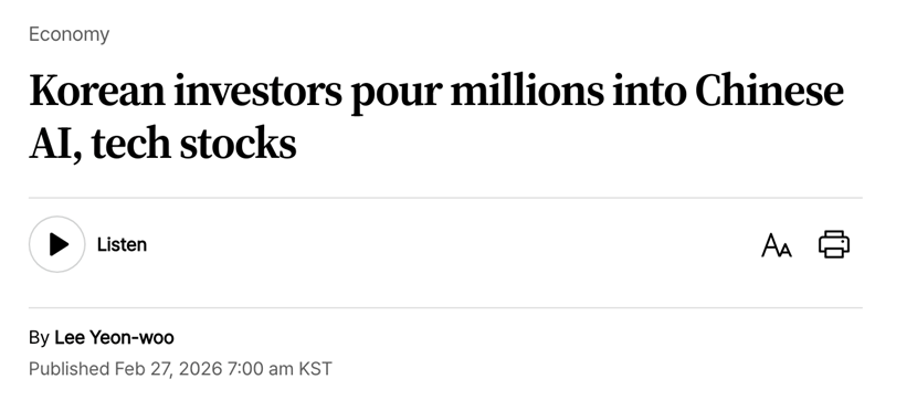 韩国投资者加速布局中国AI与科技股 配置热情持续升温
