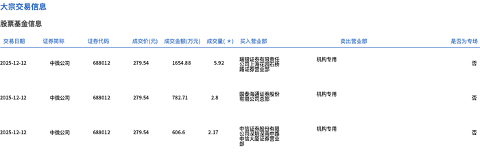 12月12日,中微公司大宗交易成交10.89万股,成交额3044.19万元,占当日总成交额的0.61%,成交价 279.54元,较市场收盘价279.54元持平。 | 交易日期 | 证券简称 | 证券代码 | 成交价(元) | | 成交金额(万元) 成交量(*) 买入营业部 | | | 类出营业部 | 是否为专场 | | --- | --- | --- | --- | --- | --- | --- | --- | --- | --- | | 2025-12-12 | 中微公司 | 688012 | 279.54 | 1654.88 | 5.92 | 2011 - 11:08:00 | 机构专用 | | Ka | | 2025-12-12 | 中微公司 | 688012 | 279.54 | 782.71 | 2.8 | 男裔泰讀國藝般的 | 机构专用 | | KI | | 2025-12-12 | 中微公司 | 688012 | 279.54 | 606.6 | 2.17 | 去問題都會寫 | 机构专用 | | Ka | ...