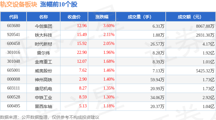 证券之星消息,10月10日轨交设备板块较上一交易日下跌0.26%,交控科技领跌。当日上证指数报收于 3897.03,下跌0.94%。深证成指报收于13355.42,下跌2.7%。轨交设备板块个股涨跌见下表: 从资金流向上来看,当日轨交设备板块主力资金净流入1.47亿元,游资资金净流入2136.04万元,散户资 金净流出1.68亿元。轨交设备板块个股资金流向见下表: | 代码 | 名称 | 收盘价 | 涨跌幅 | 成交量(手) | 成交额(元) | | | --- | --- | --- | --- | --- | --- | --- | | 603680 | 今创集团 | 12.96 | 3.60% | 6.31万 | liv | 8067.88万 | | 920541 | 铁大科技 | 15.49 | 2.11% | 1.88万 | | 2931.30万 | | 600458 | 时代新材 | 15.92 | 2.05% | 26.57万 | | 4.17亿 | | 301016 | 雷尔伟 | 22.90 | 1.96% | 8.28万 | | 1.92亿 | | 301048 | 全唐車丁 | 12.0 ...