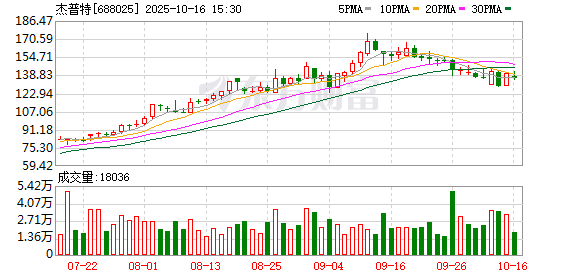 资料显示,深圳市杰普特光电股份有限公司位于广东省深圳市龙华区观湖街道鹭湖社区观盛五路8-1号 科姆龙科技园A栋1201,成立日期2006年4月18日,上市日期2019年10月31日,公司主营业务涉及研 发、生产和销售激光器以及主要用于集成电路和半导体光电相关器件精密检测及微加工的智能装备。主 营业务收入构成为:激光器53.32%,激光/光学智能装备38.19%,其他主营业务6.61%,光纤器件 1.81%,其他(补充)0.07%。 9月30日,杰普特盘中下跌2.01%,截至13:27,报140.46元/股,成交1.89亿元,换手率1.40%,总市值 133.51亿元。 分红方面,杰普特A股上市后累计派现1.57亿元。近三年,累计派现9643.77万元。 资金流向方面,主力资金净流出296.68万元,特大单买入216.23万元,占比1.14%,卖出397.43万元,占 比2.10%;大单买入2607.98万元,占比13.77%,卖出2723.46万元,占比14.37%。 杰普特今年以来股价涨198.34%,近5个交易日跌7.96%,近20日涨4.18%,近60日涨72.45%。 杰普特所属申万行业为:机械设备- ...