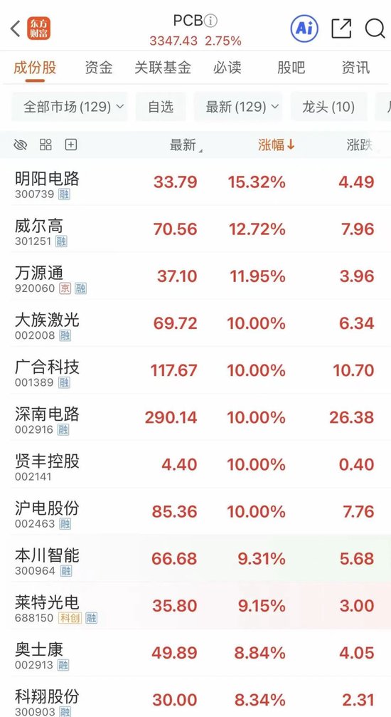 炒股就看金麒麟分析师研报,权威,专业,及时,全面,助您挖掘潜力主题机会! 2月26日早盘,算力硬件股持续活跃,PCB、CPO概念板块涨幅居前。 PCB概念拉升,明阳电路涨超15%,威尔高涨超12%,大族激光、广合科技、贤丰控股(维权)、沪电 股份10%涨停,深南电路3天2板。 | 休力 | PCB(i) | | Ai) [3 Q | | --- | --- | --- | --- | | | 3347.43 2.75% | | | | 成份股 受金 | 关联基金 必读 | 股明 | 资讯 | | 全部市场(129) v | 自选 | 最新 (129) v | 龙头(10) | | 图 品 图 | 最新 | 涨幅↓ | 涨跌 | | 明阳电路 | 33.79 | 15.32% | 4.49 | | 300739 融 | | | | | 威尔高 | 70.56 | 12.72% | 7.96 | | 301251 融 | | | | | 万源通 | 37.10 | 11.95% | 3.96 | | 920060 京 融 | | | | | 大族激光 | 69.72 | 10.00% | 6.34 | | 002 ...