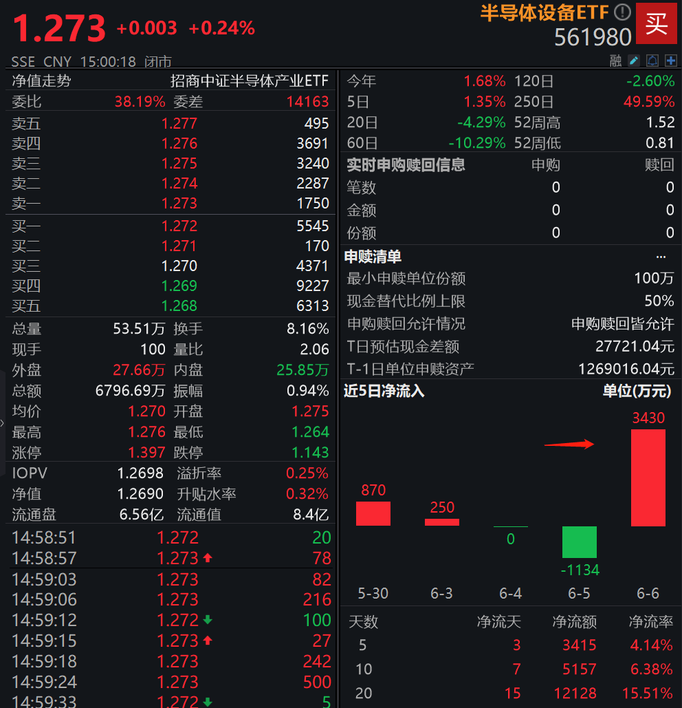 今日,海光信息、中科曙光并购重组或迎重要节点。根据此前公告,截至6月7日,海光信息、中科曙光已停牌10个交易日,预计将于6月9日 复牌。 随着后续海光信息复牌,或为半导体、算力带来新一波上行驱动,相关重仓该股的ETF也成为不少资金布局的对象。 上交所数据显示,上一交易日半导体设备ETF(561980)获得3430万元资金净申购,近20日这一净申购额升至1.21亿元。根据中证指数公司 数据,目前海光信息为该ETF标的指数第四大权重股,在指数中占比为8.58%。 此外,自海光信息停牌以来,该ETF区间份额变动率仅6.22%,相对而言,份额变动越小,规模增长对权重的稀释作用越弱,就越有望分享到 复牌后的上行行情。 | 1.273 +0.003 +0.24% | | | | 半导体设备ETF ① | | | | --- | --- | --- | --- | --- | --- | --- | | | | | | FATOON AN | | | | SSE CNY 15:00:18 闭市 | | | | | | 融 / ○ 十 | | 净值走势 | | 招商中证半导体产业ETF | 交生 | 1.68% 120日 | ...