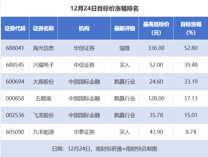 | 证券代码 证券名称 | | 机构 | 此前评级 | 最新评级 | 行业 | | --- | --- | --- | --- | --- | --- | | 688041 海光信息 | | 华创证券 | 推荐 | 彈推 | 半导体 | | | 日期:12月24日,南财投研通×南财快讯制图 | | | | | 南财投研通数据显示,12月24日,券商给予上市公司目标价共6次,按最新收盘价计算,目标价涨幅排名居前的 公司有海光信息、兴福电子、大商股份(600694),目标价涨幅分别为52.80%、39.48%、33.19%,分别属于半 导体、电子化学品、一般零售行业。 | | | 12月24日目标价涨幅排名 | | | | | --- | --- | --- | --- | --- | --- | | 证券代码 | 证券名称 | 机构 | 最新评级 | 量高目标价 (元) | 目标涨幅 (%) | | 688041 | 海光信息 | 华创证券 | 賀推 | 336.00 | 52.80 | | 688545 | 兴福电子 | 中信证券 | 买人 | 52.00 | 39.48 | | 600694 | 大商股份 ...