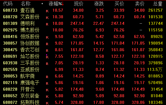 隔夜美股反弹,今早日韩芯片股上攻,A股半导体产业链也集体爆发! 11月6日,沪指涨近1%,重回4000点上方,科创50指数涨近3%。沪深两市半日成交额1.34万亿,较上个交易日放 量1880亿。 半导体产业链爆发,长光华芯20cm涨停,德明利(001309)涨停,海光信息盘中涨超10%。 电网设备股反复走强,摩恩电气(002451)3连板,保变电气(600550)一字涨停2连板。特变电工(600089)触 及涨停续创历史新高。此前伊戈尔(002922)2连板,续创历史新高,另外中国西电(601179)、正泰电器 (601877)、保变电气、顺钠股份(000533)涨停。据智通财经报道,瑞银最新发布的研究报告显示,大幅上调 对中国2028年至2030年电力需求增长的预测。 燃气轮机概念持续走高,三角防务(300775)20cm涨停,全柴动力(600218)、潍柴重机(000880)等多股涨 停。 下跌方面,旅游板块集体下挫,冰雪产业概念股领跌,大连圣亚(600593)跌停。海南板块走弱,海汽集团 (603069)触及跌停,海马汽车(000572)炸板翻绿。 港股同步走强,港股半导体板块持续拉升。香港恒生科技指数 ...