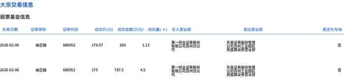 | 交易日期 | 证券简称 | 证券代码 | | | 成交价(元) 成交金额(万元) 成交量( *) 买入营业部 | | 类出营业部 | 是否为专场 | | --- | --- | --- | --- | --- | --- | --- | --- | --- | | 2026-02-06 | 纳苏做 | 688052 | 176.57 | 200 | 113 | 有限公司系需分公 | 222223 | Ka | | 2026-02-06 | 纳达做 | 688052 | 175 | 787.5 | 4.5 | 看展公司系帮努发 | 2018 201 | Ka | 2月6日,纳芯微大宗交易成交5.63万股,成交额987.5万元,占当日总成交额的2.43%,成交均价175.4 元,较市场收盘价174.17元溢价0.71%,其中最高成交价176.57元,最低成交价175元。 ...