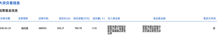 Group 1 - The core point of the news is that Naxin Micro conducted a block trade on January 13, with a total of 53,100 shares traded, amounting to 7.8678 million yuan, which represents 1.6% of the total trading volume for that day [1][2] - The transaction price was 148.17 yuan, which is a discount of 13.01% compared to the market closing price of 170.33 yuan [1]
