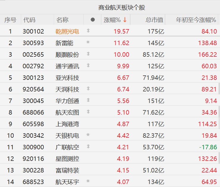 Core Viewpoint - The commercial aerospace sector in the A-share market has shown significant activity, driven by the National Space Administration's recent action plan for high-quality and safe development in commercial aerospace from 2025 to 2027, which aims to enhance the industry's overall layout and achieve substantial growth and innovation [1] Summary by Category Market Activity - The commercial aerospace stocks experienced notable increases, with Qianzhao Optoelectronics rising over 19%, Xinle Energy up over 11%, and Shunhao Co. and Tongyu Communication hitting the 10% limit up [1] - Other companies such as Yaguang Technology and Tianrun Technology saw increases of over 6%, while Huali Chuantong and Aerospace Hongtu rose over 5% [1] Company Performance - Qianzhao Optoelectronics: Increased by 19.57%, with a total market value of 17.5 billion and a year-to-date increase of 84.10% [2] - Xinle Energy: Increased by 11.62%, with a market value of 14.5 billion and a year-to-date increase of 138.48% [2] - Shunhao Co.: Increased by 10.00%, with a market value of 8.512 billion and a year-to-date increase of 166.22% [2] - Tongyu Communication: Increased by 9.99%, with a market value of 12.5 billion and a year-to-date increase of 60.03% [2] - Other notable performers include Yaguang Technology (6.67%), Tianrun Technology (6.74%), Huali Chuantong (5.56%), and Aerospace Hongtu (5.10%) [2]