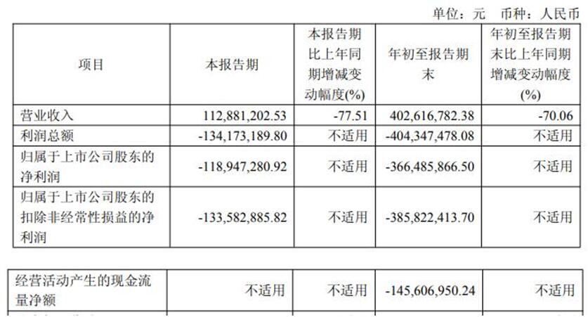 中国经济网北京11月19日讯 航天宏图(688066.SH)近日发布2025年第三季度报告。今年前三季度,公司实现营业收 入4.03亿元,同比下降70.06%;归属于上市公司股东的净利润-3.66亿元,上年同期-2.22亿元;归属于上市公司股东的 扣除非经常性损益的净利润-3.86亿元,上年同期-2.66亿元;经营活动产生的现金流量净额为-1.46亿元,上年同期 为-4.06亿元。 | 市秤: 人民币 | | --- | | JL | | . . | | 单位 | | | | 本报告期 比上年同 | 年初至报告期 | 年初至报告期 末比上年同期 | | --- | --- | --- | --- | --- | | 项目 | 本报告期 | | | | | | | 期增减变 | ズ | 增减变动幅度 | | | | 动幅度(%) | | (%) | | 营业收入 | 112,881,202.53 | -77.51 | 402,616,782.38 | -70.06 | | 利润总额 | -134.173.189.80 | 不适用 | -404,347,478.08 | 不适用 | | 归属于上市公司股东的 | ...