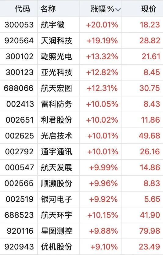 消息面上,据国家航天局消息,该局已于近期设立商业航天司,相关业务正在逐步开展。 编辑 | 钉钉 | 代码 | 名称 | 涨幅%√ | 现价 | | --- | --- | --- | --- | | 300053 | 航宇微 | +20.01% | 18.23 | | 920564 | 天润科技 | +19.19% | 28.82 | | 300102 | 乾照光电 | +13.32% | 21.61 | | 300123 | 亚光科技 | +12.82% | 8.45 | | 688066 | 航天宏图 | +12.31% | 30.75 | | 002413 | 雷科防务 | +10.05% | 8.43 | | 002651 | 利君股份 | +10.02% | 11.86 | | 002625 | 光启技术 | +10.01% | 49.68 | | 002792 | 通宇通讯 | +10.01% | 26.16 | | 000547 | 航天发展 | +9.99% | 14.86 | | 002565 | 顺灏股份 | +9.96% | 8.83 | | 002519 | 银河电子 | +9.92% ...