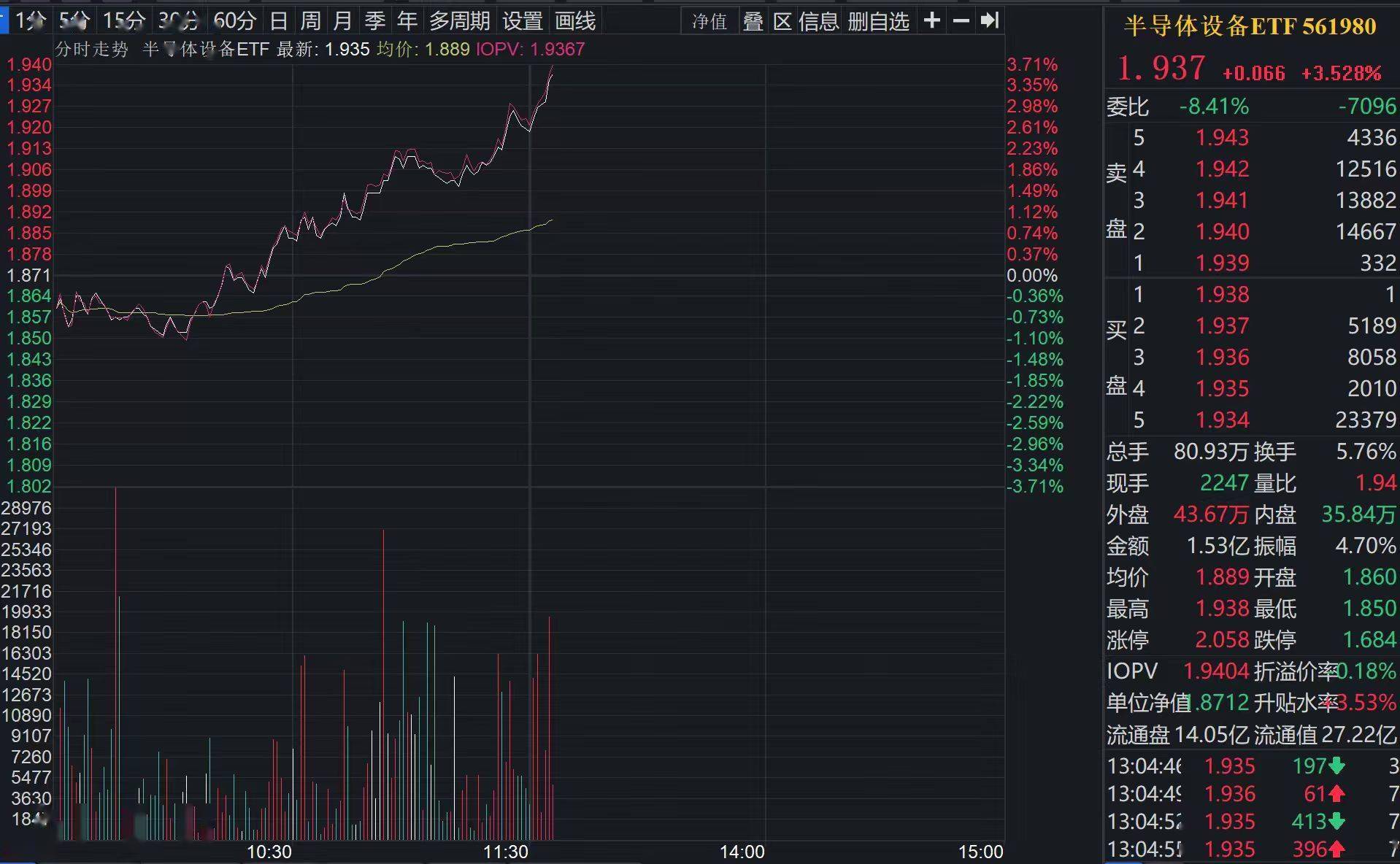 涨势扩大!半导体设备ETF(561980)午后飙涨3.53%,全球设备景气复苏与国产替代双重受益