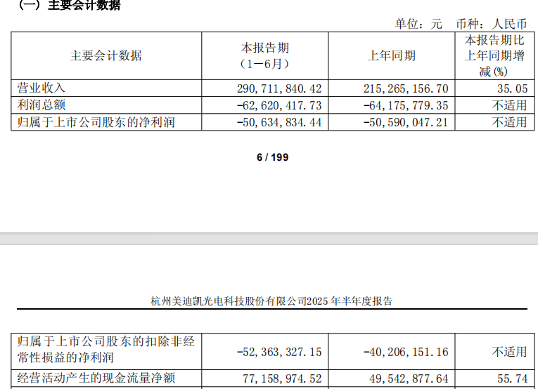 中国经济网北京10月16日讯 美迪凯(688079.SH)日前发布2025年半年度报告。今年上半年,公司实现 营业收入2.91亿元,同比增长35.05%;归属于上市公司股东的净利润-5063.48万元;归属于上市公司股东的 扣除非经常性损益的净利润-5236.33万元;经营活动产生的现金流量净额7715.90万元。 | | | | 単位: 元 | | --- | --- | --- | --- | | 主要会计数据 | 本报告期 | | 本报告期比 上年同期增 | | | (1-6月) | 上年同期 | | | | | | 濾(%) | | 营业收入 | 290, 711, 840. 42 | 215, 265, 156. 70 | 35. 05 | | 利润总额 | -62, 620, 417. 73 | -64, 175, 779. 35 | 不适用 | | 归属于上市公司股东的净利润 | -50, 634, 834. 44 | -50,590,047.21 | 不适用 | 2023年,美迪凯实现营业收入3.21亿元,同比下降22.48%;归属于上市公司股东的净利润-8445.09万 元,上年同期为220 ...