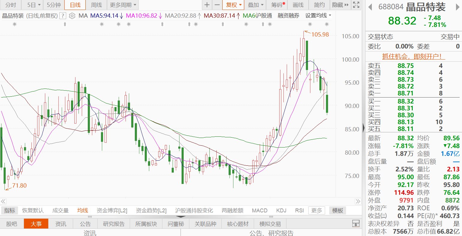 晶品特装(688084.SH)跌7.81%,报88.32元,总市值66.82亿元。军队采购网于2026年1月26日发布公告,武警部队采购管理部门根据军队供应商管理相关规定 禁止北京晶品特装科技股份有限公司自2026年1月26日起3年内参加武警部队范围物资工程服务采购活动。晶品特装称,本次处理结果对公司有一定影响,但 武警部队范围内军队物资工程服务相关收入在公司整体营业收入中的占比较小。公司将进一步优化业务布局,积极拓展其他领域的业务,努力保障经营稳定 和可持续发展,同时加强招投标管理和代理商管理,严格遵循相关法律法规及采购规范。(格隆汇) ...
