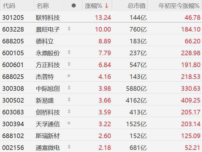 Core Viewpoint - The CPO concept stocks in the A-share market continue to show strong performance, with several companies reaching new historical highs in their stock prices [1]. Group 1: Stock Performance - LianTe Technology (301205) increased by 13.24%, with a total market value of 14.4 billion and a year-to-date increase of 46.78% [2]. - Jingwang Electronics (603228) hit the daily limit with a 10% increase, having a market value of 76 billion and a year-to-date increase of 184.10% [2]. - Dekeli (688205) rose by 8.89%, with a market value of 18.3 billion and a year-to-date increase of 66.20% [2]. - Yongding Co., Ltd. (600105) increased by 7.79%, with a market value of 23.7 billion and a year-to-date increase of 228.98% [2]. - Founder Technology (600601) rose by 6.84%, with a market value of 54.7 billion and a year-to-date increase of 191.80% [2]. - JepuTe (688025) increased by 4.16%, with a market value of 14.3 billion and a year-to-date increase of 218.53% [2]. - Zhongji Xuchuang (300308) rose by 3.98%, with a market value of 588 billion and a year-to-date increase of 330.63% [2]. - Xinyi Sheng (300502) increased by 3.66%, with a market value of 416.2 billion and a year-to-date increase of 409.25% [2]. - Cambridge Technology (603083) rose by 3.59%, with a market value of 41.3 billion and a year-to-date increase of 205.17% [2]. - Tianfu Communication (300394) increased by 3.22%, with a market value of 152.5 billion and a year-to-date increase of 203.14% [2]. - Sry New Materials (688102) rose by 2.60%, with a market value of 15.2 billion and a year-to-date increase of 125.09% [2]. - Tongfu Microelectronics (002156) increased by 2.18%, with a market value of 68.1 billion and a year-to-date increase of 52.21% [2]. Group 2: Historical Highs - Notable companies such as Founder Technology, Zhongji Xuchuang, Xinyi Sheng, and Sry New Materials have reached new historical highs in their stock prices [1].