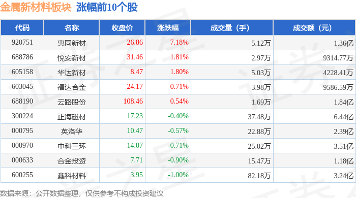 证券之星消息,1月20日金属新材料板块较上一交易日下跌2.41%,斯瑞新材领跌。当日上证指数报收于 4113.65,下跌0.01%。深证成指报收于14155.63,下跌0.97%。金属新材料板块个股涨跌见下表: | 代码 | 名称 | 主力净流入(元) | 主力净占比 游资净流入 (元) | | 游资净占比 散户净流入(元) | | 散户净占比 | | --- | --- | --- | --- | --- | --- | --- | --- | | 300811 | | 2497.80万 | 3.90% | 3367.69万 | 5.26% | -5865.49万 | -9.16% | | 688190 | 云路股份 | 1682.48万 | 9.16% | 1034.02万 | 5.63% | -2716.50万 | -14.79% | | 300855 图南股份 | | 1462.36万 | 2.38% | -2424.44万 | -3.94% | 962.08万 | 1.56% | | 920751 惠同新材 | | 1270.55万 | 9.37% | 376.17万 | 2.77% | -211. ...