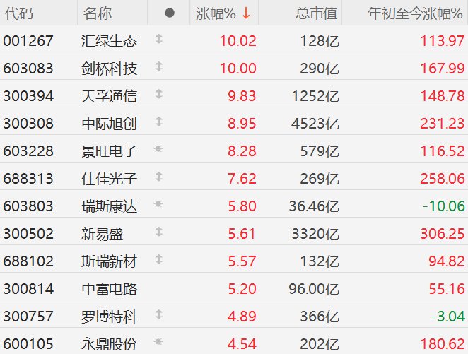 格隆汇10月20日|A股市场CPO概念表现强势,其中,汇绿生态、剑桥科技涨停,天孚通信涨超9%,中 际旭创、景旺电子涨超8%,仕佳光子涨超7%,瑞斯康达、新易盛、斯瑞新材、中富电路涨超5%。 MACD金叉信号形成,这些股涨势不错! | 代码 | 名称 | | 涨幅% ↓ | 总市值 | 年初至今涨幅% | | --- | --- | --- | --- | --- | --- | | 001267 | 汇绿生态 | 1 | 10.02 | 128亿 | 113.97 | | 603083 | 剑桥科技 | 1 | 10.00 | 290亿 | 167.99 | | 300394 | 天孚通信 | 1 | 9.83 | 1252亿 | 148.78 | | 300308 | 中际相创 | 1 | 8.95 | 4523亿 | 231.23 | | 603228 | 景旺电子 | 兼 | 8.28 | 579亿 | 116.52 | | 688313 | 仕佳光子 | 1 | 7.62 | 269亿 | 258.06 | | 603803 | 瑞斯康达 | 张 | 5.80 | 36.46亿 | -10.06 | ...