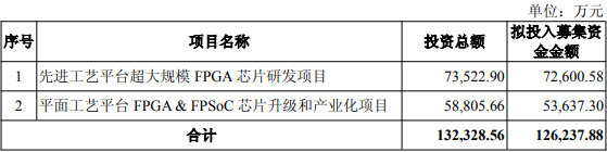 本次向特定对象发行的股票种类为境内上市人民币普通股(A股),每股面值为人民币1.00元。 | | | | | | | -- | | --- | --- | --- | --- | | 序号 | 项目名称 | 投资总额 | 拟投入事集资 | | | | | 金金额 | | | 1 先进工艺平台超大规模 FPGA 芯片研发项目 | 73,522.90 | 72,600.58 | | 2 | 平面工艺平台 FPGA & FPSoC 芯片升级和产业化项目 | 58,805.66 | 53,637.30 | | | 合计 | 132,328.56 | 126,237.88 | 本次发行采取向特定对象发行股票方式,公司将在通过上交所审核并取得中国证监会同意注册后, 在有效期内择机向特定对象发行股票。 本次发行的发行对象为不超过35名(含35名)符合法律法规规定的特定对象,包括证券投资基金管 理公司、证券公司、信托公司、财务公司、资产管理公司、保险机构投资者、合格境外机构投资者以及 其他符合法律法规规定的法人、自然人或其他机构投资者等。证券投资基金管理公司、证券公司、合格 境外机构投资者、人民币合格境外机构投资者以其管理的 ...