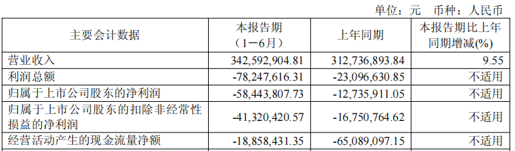 | 主要会计数据 | 本报告期 | 上年同期 | 本报告期比上年 | | --- | --- | --- | --- | | | (1-6月) | | 同期增减(%) | | 营业收入 | 342,592,904.81 | 312,736,893.84 | 9.55 | | 利润总额 | -78,247,616.31 | -23.096.630.85 | 不适用 | | 归属于上市公司股东的净利润 | -58.443.807.73 | -12,735,911.05 | 不适用 | | 归属于上市公司股东的扣除非经常性 | -41,320,420.57 | -16.750.764.62 | 不适用 | | 损益的净利润 | | | | | 经营活动产生的现金流量净额 | -18.858.431.35 | -65.089.097.15 | 不适用 | 公司2024年度营业收入为71,112.50万元,较上年同期上涨50.53%;归属于上市公司股东的净利润 为-3,074.52万元,较上年同期下降205.41%;扣非后归属于上市公司股东的净利润-3,455.23万元,较上年同期下 降361.65%;经营活动产生的现 ...