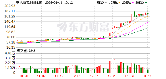 安达智能股价再创历史新高,该股近期呈不断突破新高之势,近一个月累计有11个交易日股价刷新历史 纪录。截至09:32,该股目前上涨3.15%,股价报180.39元,成交5.52万股,成交金额995.98万元,换手 率0.07%,该股最新A股总市值达148.15亿元,该股A股流通市值147.36亿元。 公司发布的三季报数据显示,前三季度公司共实现营业收入5.01亿元,同比下降8.01%,实现净利 润-9697.37万元,同比下降933.97%,基本每股收益为-1.2000元。(数据宝) (文章来源:证券时报网) 证券时报·数据宝统计显示,安达智能所属的机械设备行业,目前整体涨幅为0.80%,行业内,目前股价 上涨的有445只,涨幅居前的有南风股份、三佳科技、光力科技等,涨幅分别为7.89%、7.25%、 7.21%。股价下跌的有129只,跌幅居前的有巨力索具、南兴股份、鲁信创投等,跌幅分别为10.00%、 9.92%、9.73%。 两融数据显示,该股最新(1月15日)两融余额为2.23亿元,其中,融资余额为2.23亿元,近10日增加 445.50万元,环比增长2.04%。 ...