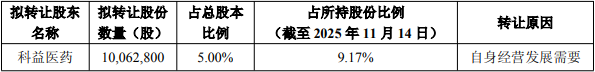 中国经济网北京11月17日讯 科兴制药(688136.SH)11月14日发布股东询价转让计划书。本次拟参与 科兴制药首发前股东询价转让(以下简称"本次询价转让")的股东为科益医药;出让方拟转让股份的总 数为10,062,800股,占公司总股本的比例为5.00%;本次询价转让为非公开转让,不通过集中竞价交易 方式或大宗交易方式进行,不属于通过二级市场减持。受让方通过询价转让受让的股份,在受让后6个 月内不得转让;本次询价转让的受让方为具备相应定价能力和风险承受能力的机构投资者。 | 拟转让股东 拟转让股份 | | 占总股本 | 占所持股份比例 | 转让原因 | | --- | --- | --- | --- | --- | | 名称 | 数量(股) | 比例 | (截至2025年11月14日) | | | 科益医药 | 10,062,800 | 5.00% | 9.17% | 自身经营发展需要 | 本次询价转让出让方科益医药为公司控股股东,持有公司股份比例超过5%。公司董事长邓学勤通 过科益医药间接持有公司股份。 按照科兴制药11月14日收盘价37.55元计算,科益医药本次询价转让股份对应总市值约3.78亿元。 ...