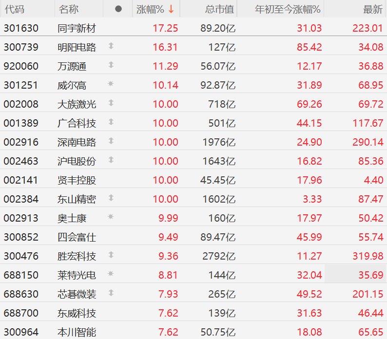 MACD金叉信号形成,这些股涨势不错! | 代码 | 名称 | | 涨幅% ↓ | 总市值 | 年初至今涨幅% | 最新 | | --- | --- | --- | --- | --- | --- | --- | | 301630 | 同宇新材 | | 17.25 | 89.20亿 | 31.03 | 223.01 | | 300739 | 明阳电路 | 1 | 16.31 | 127亿 | 85.42 | 34.08 | | 920060 | 力源通 | 1 | 11.29 | 56.07亿 | 12.17 | 36.88 | | 301251 | 威尔高 | 一般 | 10.14 | 92.87 亿 | 31.89 | 68.95 | | 002008 | 大族激光 | 4 | 10.00 | 718亿 | 69.26 | 69.72 | | 001389 | 广合科技 | 1 | 10.00 | 501亿 | 44.15 | 117.67 | | 002916 | 深南电路 | 1 | 10.00 | 1976 Z | 24.90 | 290.14 | | 002463 | 沪电股份 | 1 | 10. ...