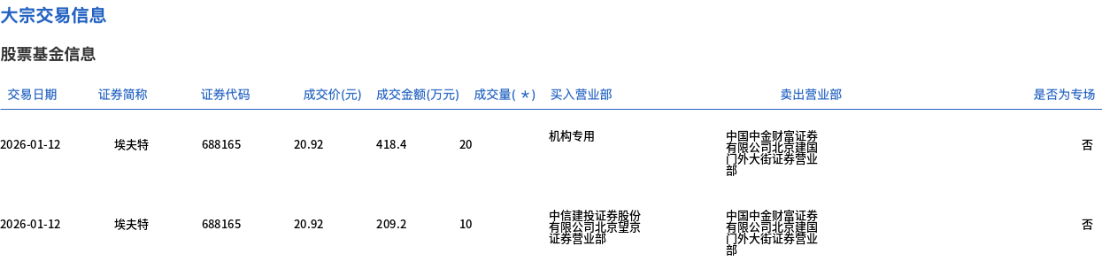 Group 1 - On January 12, a block trade of 300,000 shares of Evert was executed, with a transaction amount of 6.276 million yuan, accounting for 1.64% of the total transaction volume for the day [1] - The transaction price was 20.92 yuan, which represents a discount of 12.17% compared to the market closing price of 23.82 yuan [1] - The total transaction amount included 4.184 million yuan from institutional trading and 2.092 million yuan from a specific brokerage [2]