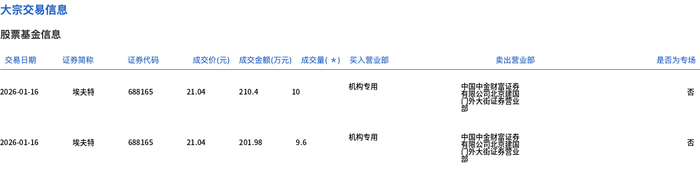 Group 1 - On January 16, Evert executed a block trade of 196,000 shares, with a transaction value of 4.1238 million yuan, accounting for 0.88% of the total trading volume for the day [1] - The transaction price was 21.04 yuan, representing a discount of 12.08% compared to the market closing price of 23.93 yuan [1] - The block trade involved institutional buyers, indicating a strategic investment approach [2]