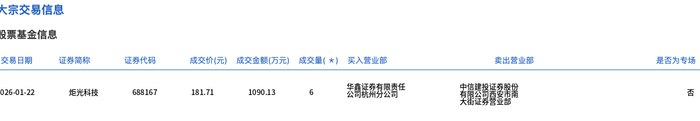 1月22日,炬光科技大宗交易成交6万股,成交额1090.13万元,占当日总成交额的1.17%,成交价181.71 元,较市场收盘价194.83元折价6.73%。 | 股票基金信息 | | | | | | --- | --- | --- | --- | --- | | 交易日期 | 证券简称 | 证券代码 | 成交价(元) 成交金额(万元) 成交量(*) 买入营业部 | 卖出营业部 | | 026-01-22 | 炬光科技 | 688167 | 丢鳥ほ免有思想任 181.71 1090.13 | 申摘思想话委常案 | ...