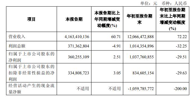 (责任编辑:华青剑) | 项目 | 本报告期 | 本报告期比上 年同期增减变 | 年初至报告期 | 年初至报告期 末比上年同期 | | --- | --- | --- | --- | --- | | | | 动幅度(%) | 末 | 增减变动幅度 | | | | | | (%) | | 营业收入 | 4.163.410.136 | 60.71 | 12,066,472,888 | 72.22 | | 利润总额 | 371.362.804 | -4.91 | 1.014.354.896 | -32.25 | | 归属于上市公司股东的 | 360,255,109 | 2.51 | 1,037,760,855 | -29.51 | | 净利润 | | | | | | 归属于上市公司股东的 扣除非经常性损益的净 | 334.808.723 | 3.05 | 834.605.154 | -29.63 | | 利润 | | | | | | 经营活动产生的现金流 | 不适用 | 不适用 | -1.059.785.772 | -200.00 | | 量净额 | | | | | 中国经济网北京10月31日讯 石头科技(6881 ...